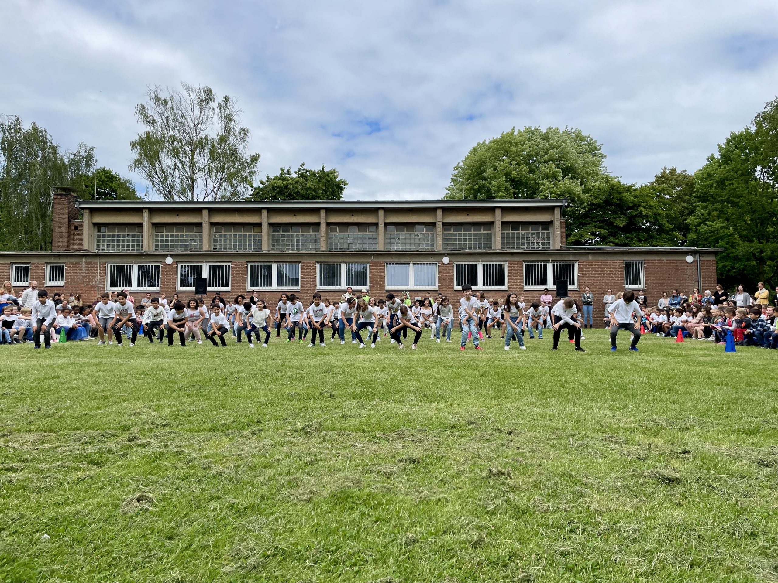 Bei sonnigem Wetter haben die Kinder, Lehrkräfte der Lindenschule